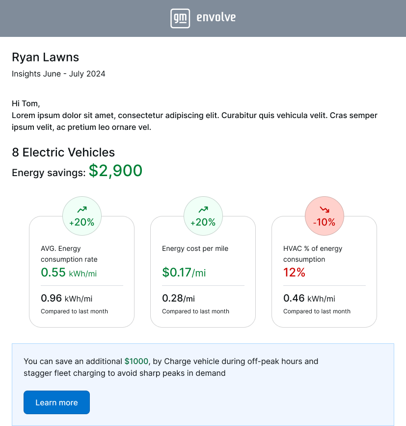 Designs for fleet insights emails and dashboards. The intelligent dashboard provides fleet owners with actionable insights to help reduce costs, enhance operational efficiency, and maximize fleet savings.